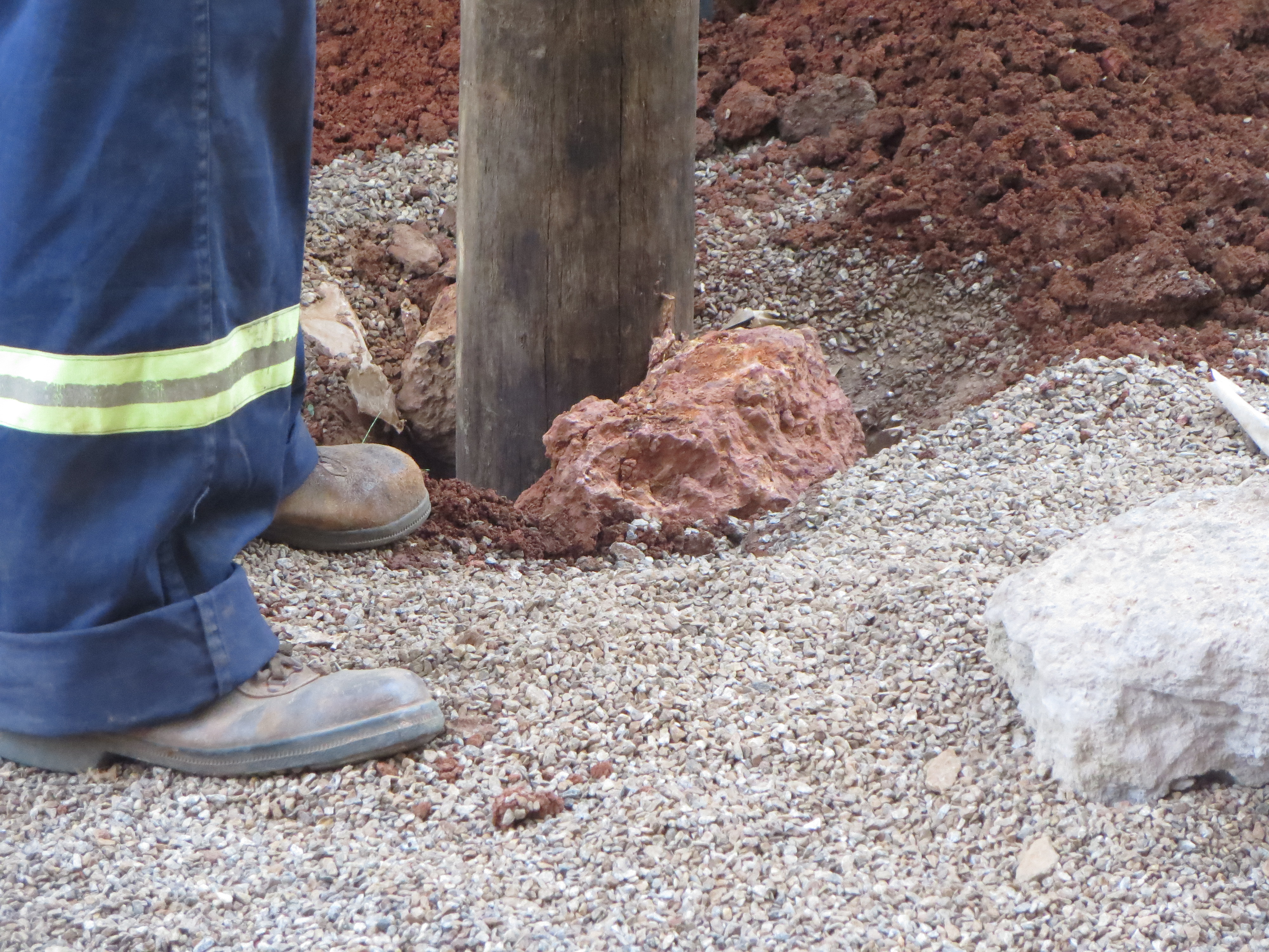 One day during rainy season, the electrical pole at FES was noticed to be leaning a bit. A few day later, and a good storm later, it was noted to be leaning significantly and directly over the walkway and gate to the school. We called the Maintenance Department and put the request in to the electric company to have the pole replaced as it was clear that termites had been feasting for quite a while on the base of the pole. The gate and walkway became off-limits to students, staff and parents.