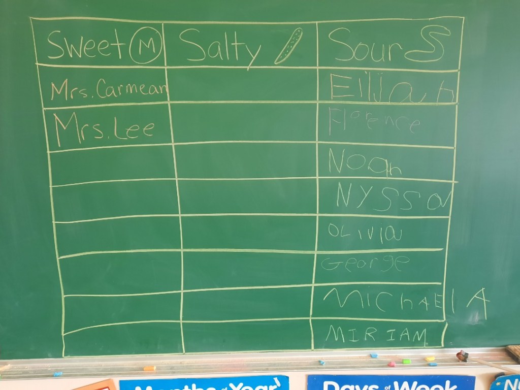 Day 5 – Taste! They had an afternoon snack of a sour gummy worm, sweet M & M, and salty pretzel.