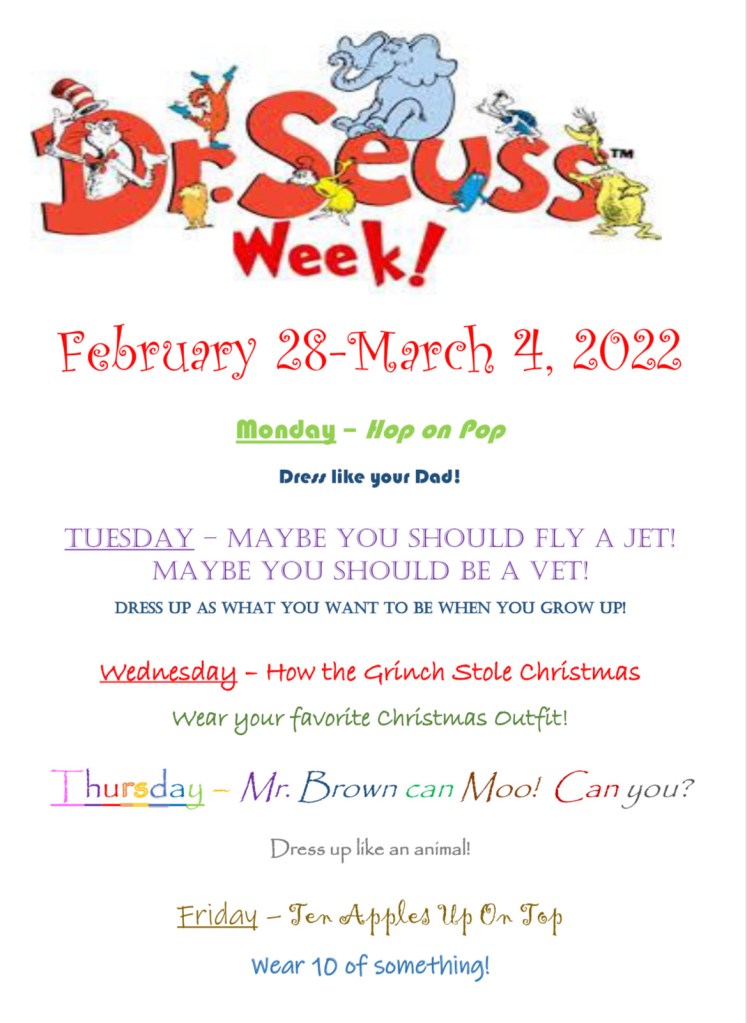 During the week of Dr. Seuss’ birthday, we have WaCkY wEeK! Every day we choose a Dr. Seuss book to read to the students out loud (by a surprise guest reader). We ask the students to dress up, if they want to join in the fun!